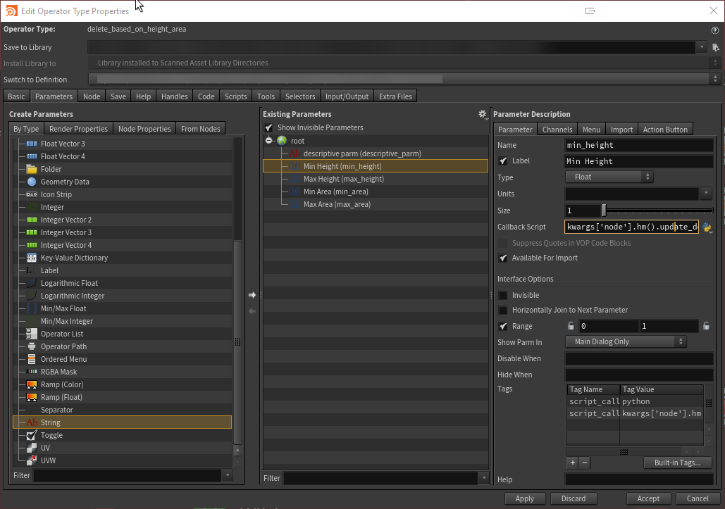 We can then grab specific parms from the hda that we want to show in the descriptive parm. In this case we are grabbing each of the parms of min/max height, min/max area and then constructing a string from those parms and finally setting the invisible parm we created that is being referenced in the descriptive parm input under the HDA's Type Properties window in the Node Tab. I have named that invisible parm descriptive_parm to be explicit.